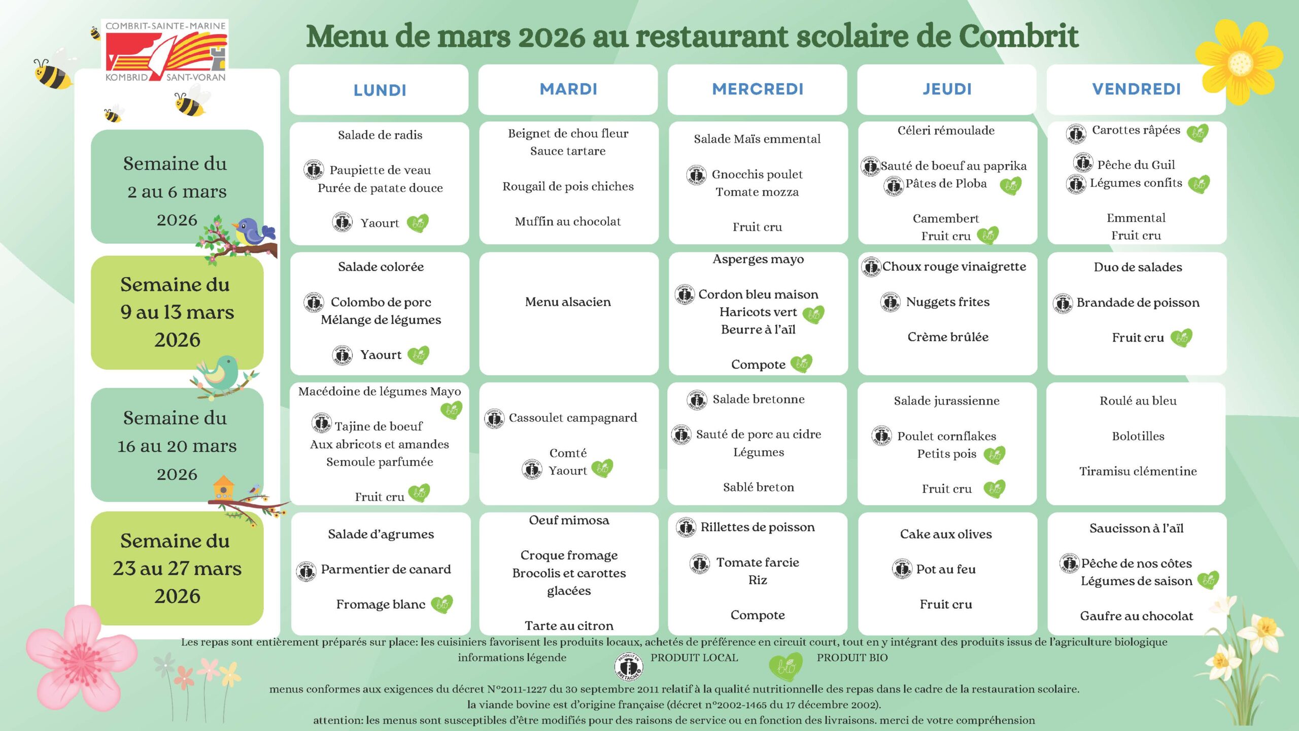 Le restaurant scolaire est ouvert du lundi au vendredi. Le premier service a lieu de 11h45 à 12h30 pour les enfants de l’école publique Danielle Kernafflen, le second service de 12h45 à 13h30 pour les élémentaires de l’école Notre-Dame de la Clarté. Les repas de l’école de Sainte-Marine sont livrés en liaison chaude. Ils sont servis de 11h45 à 12h30.